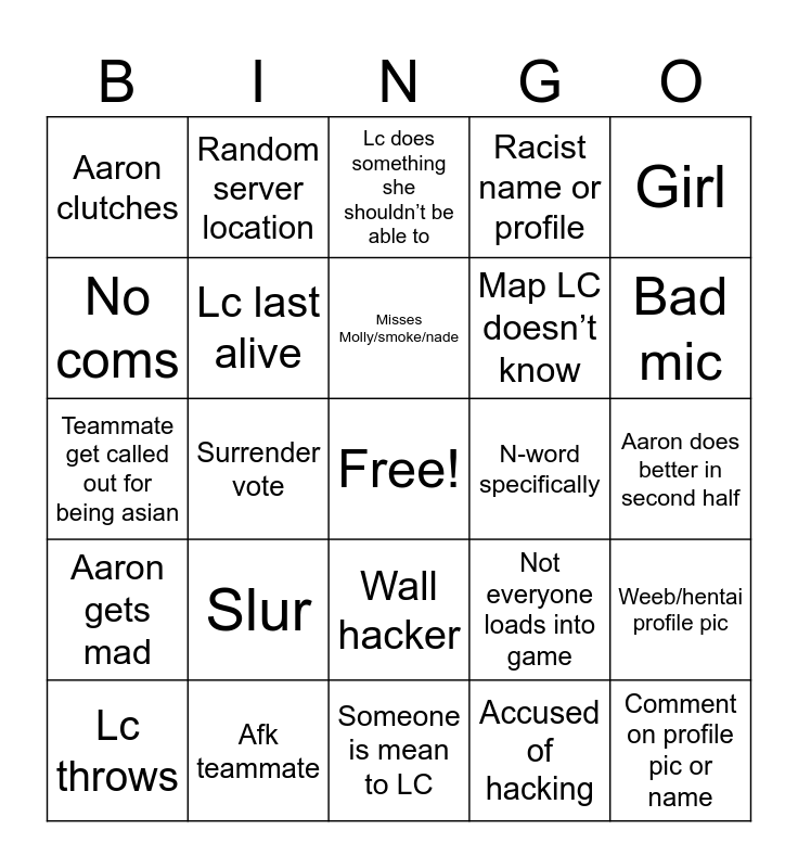 This bingo card has a free space and 24 words: Slur, Afk teammate, Misses Molly/smoke/nade, Lc throws, Girl, Aaron clutches, No coms, Random server location, N-word specifically, Wall hacker, Map LC doesn’t know, Teammate get called out for being asian, Not everyone loads into game, Weeb/hentai profile pic, Lc last alive, Accused of hacking, Aaron does better in second half, Lc does something she shouldn’t be able to, Bad mic, Surrender vote, Comment on profile pic or name, Aaron gets mad, Racist name or profile and Someone is mean to LC.