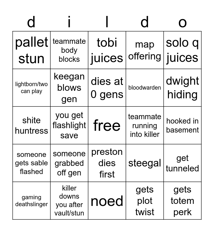 This bingo card has a free space and 31 words: noed, the ghoul, you get flashlight save, solo q dc, pallet stun, tobi juices, keegan blows gen, steegal, teammate running into killer, gets plot twist, hooked in basement, gets totem perk, preston dogs on keegan for no reason, dead mans, dwight hiding, killer slugs, get tunneled, someone grabbed off gen, someone gets sable flashed, preston dies first, solo q juices, gets invocation perk, gaming deathslinger, teammate body blocks, bloodwarden, lightborn/two can play, map offering, shite huntress, killer downs you after vault/stun, dies at 0 gens and 4 man out.