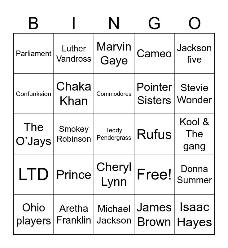 This bingo card has 25 words: Prince, Michael Jackson, Commodores, Ohio players, Jackson five, Parliament, Confunksion, Luther Vandross, Rufus, Cheryl Lynn, Pointer Sisters, The O’Jays, Free!, Donna Summer, Chaka Khan, Isaac Hayes, Kool & The gang, Marvin Gaye, Stevie Wonder, Smokey Robinson, Teddy Pendergrass, Aretha Franklin, LTD, Cameo and James Brown.