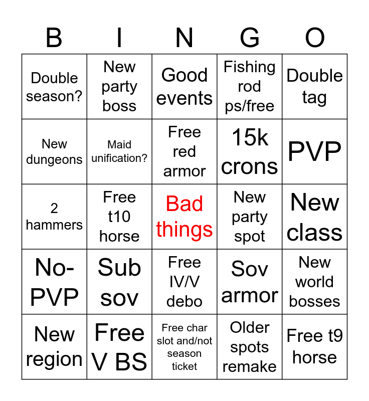 This bingo card has a free space and 24 words: Sub sov, Free V BS, Free red armor, New region, Double tag, Double season?, New dungeons, New party boss, New party spot, Free IV/V debo, 15k crons, 2 hammers, Sov armor, New world bosses, Maid unification?, Older spots remake, New class, Good events, PVP, Free t10 horse, Free t9 horse, No-PVP, Fishing rod ps/free and Free char slot and/not season ticket.