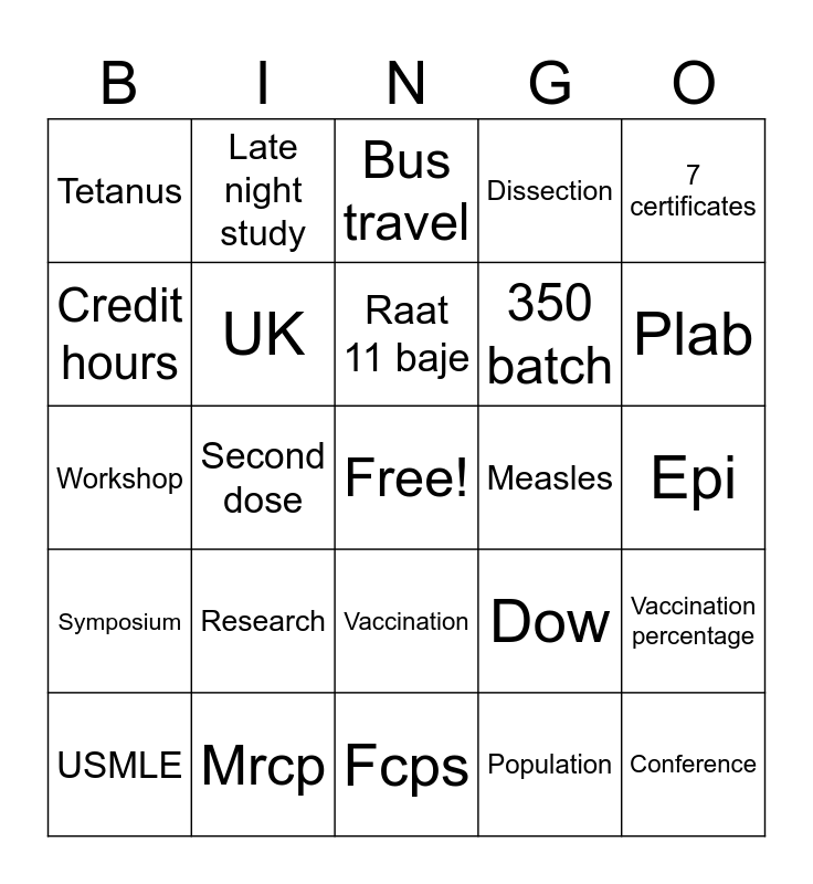 This bingo card has a free space and 24 words: USMLE, Research, Raat 11 baje, Population, 7 certificates, Tetanus, Late night study, Bus travel, Measles, Epi, Workshop, UK, Dow, Vaccination percentage, Credit hours, Mrcp, Fcps, Dissection, Plab, Symposium, Second dose, Vaccination, 350 batch and Conference.