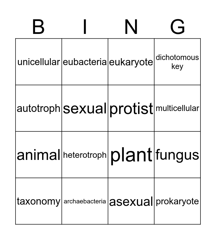 This bingo card has a free space and 15 words: taxonomy, prokaryote, eukaryote, unicellular, multicellular, autotroph, heterotroph, asexual, sexual, animal, fungus, dichotomous key, protist, eubacteria and archaebacteria.