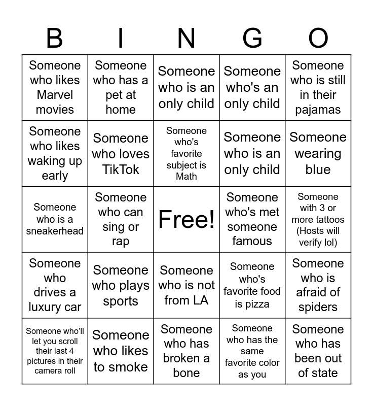 This bingo card has a free space and 49 words: Someone who has siblings, Someone who has been out of state, Someone with the same birthday month as you, Someone who has broken a bone, Someone who plays sports, Someone who wears glasses, Someone who has a pet at home, Some who is left-handed, Someone who likes waking up early, Someone who loves playing video games, Someone who loves TikTok, Someone who's an only child, Someone who is afraid of spiders, Someone who's favorite food is pizza, Someone who likes to dance, Someone who is a Lakers fan, Someone who's favorite subject is Math, Someone who's met someone famous, Someone who ate breakfast this morning, Someone who is still in their pajamas, Someone who can sing or rap, Someone who has the same favorite color as you, Someone who likes Marvel movies, Someone who is an only child, Someone who has a sibling, Someone wearing blue, Someone who’ll let you scroll their last 4 pictures in their camera roll, Someone who has the same birthday month as you, Someone who is not from LA, Someone who drives a luxury car, Someone with a nice smile, Someone who is a parent, Someone who procrastinates, Someone who likes to communicate, Someone who likes to smoke, Someone who has been to at least 3 countries, Someone who has the same favorite color as you, Someone who is taller than you, Someone with 3 or more tattoos (Hosts will verify lol), Someone who consistently works out, Someone who went to see Kendrick, Someone who has 60% or less battery on their phone, Someone who wears glasses, Someone who likes to drink, Someone who is a sneakerhead, Someone who is an only child, Someone who has broken a bone, Someone who is engaged/married and Someone who works in the same career as you.