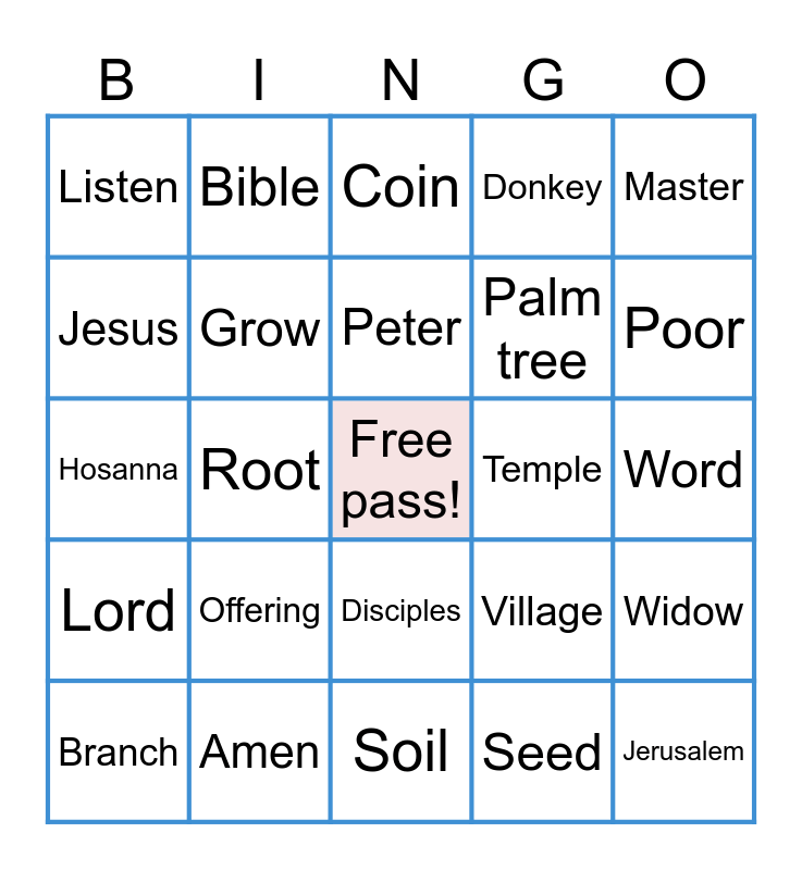 This bingo card has a free space and 24 words: Offering, Amen, Peter, Branch, Master, Listen, Jesus, Bible, Temple, Disciples, Palm tree, Hosanna, Village, Widow, Grow, Seed, Word, Coin, Poor, Root, Jerusalem, Lord, Donkey and Soil.