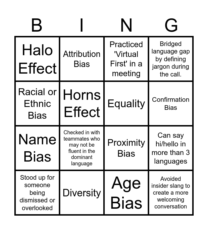 This bingo card has 26 words: Free!, Affinity Bias, Confirmation Bias, Gender Bias, Racial or Ethnic Bias, Halo Effect, Horns Effect, Attribution Bias, Age Bias, Beauty or Appearance Bias, Name Bias, Proximity Bias, Conformity Bias, Recency affect, Can say hi/hello in more than 3 languages, Corrected someone who made assumptions based on one's accent, Bridged language gap by defining jargon during the call., Avoided insider slang to create a more welcoming conversation, Practiced 'Virtual First' in a meeting, Stood up for someone being dismissed or overlooked, Checked in with teammates who may not be fluent in the dominant language, Switched to English in a conversation for inclusivity/ people to feel comfortable, Diversity, Inclusion, Equality and #breakthebias.