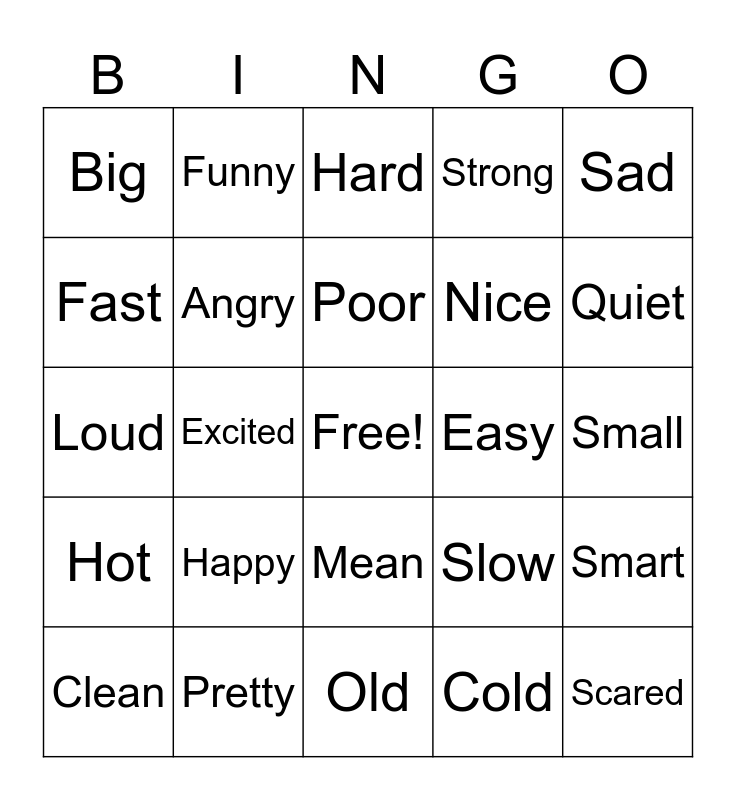 This bingo card has a free space and 24 words: Happy, Pretty, Poor, Clean, Sad, Big, Fast, Funny, Easy, Mean, Nice, Loud, Slow, Smart, Angry, Cold, Small, Hard, Quiet, Excited, Scared, Hot, Strong and Old.