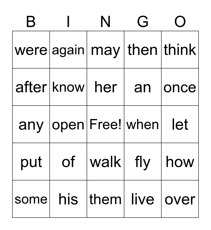 This bingo card has a free space and 24 words: of, his, her, some, think, were, after, again, when, walk, an, any, fly, how, know, live, let, may, once, open, over, put, then and them.