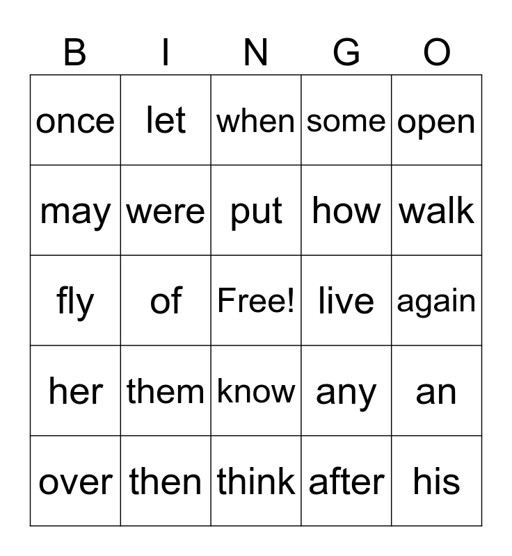 This bingo card has a free space and 24 words: them, then, put, over, open, once, may, let, live, know, how, fly, any, an, were, after, again, when, walk, of, his, her, some and think.
