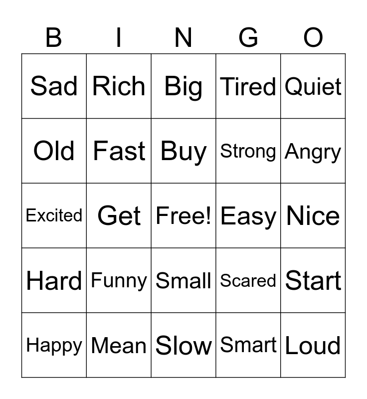 This bingo card has a free space and 29 words: Happy, Pretty, Get, Clean, Sad, Big, Fast, Funny, Easy, Mean, Nice, Loud, Slow, Smart, Angry, Cold, Small, Hard, Quiet, Excited, Scared, Hot, Strong, Old, Tired, Rich, Start, Buy and Throw.
