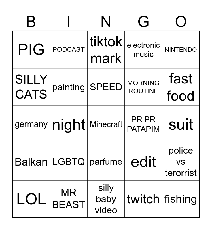 This bingo card has a free space and 24 words: LGBTQ, MR BEAST, SPEED, LOL, NINTENDO, PIG, SILLY CATS, PODCAST, PR PR PATAPIM, parfume, MORNING ROUTINE, germany, edit, police vs terorrist, painting, twitch, suit, tiktok mark, fast food, night, fishing, Balkan, electronic music and silly baby video.