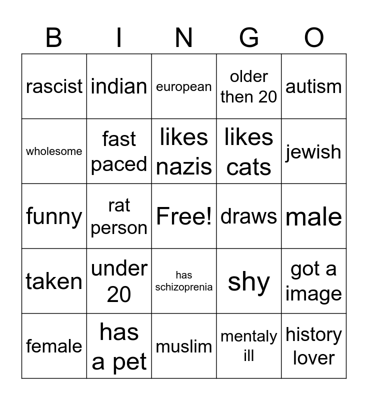 This bingo card has a free space and 24 words: under 20, has a pet, likes nazis, female, autism, rascist, wholesome, indian, draws, has schizoprenia, likes cats, funny, shy, got a image, fast paced, mentaly ill, male, european, jewish, rat person, history lover, taken, older then 20 and muslim.
