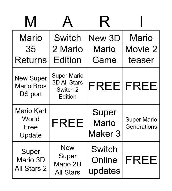 This bingo card has 16 words: New Super Mario 2D All Stars, Super Mario Generations, New 3D Mario Game, Mario 35 Returns, Mario Kart World Free Update, Switch 2 Mario Edition, Super Mario Maker 3, Switch Online updates, New Super Mario Bros DS port, Super Mario 3D All Stars Switch 2 Edition, Super Mario 3D All Stars 2, Mario Movie 2 teaser, FREE, FREE, FREE and FREE.