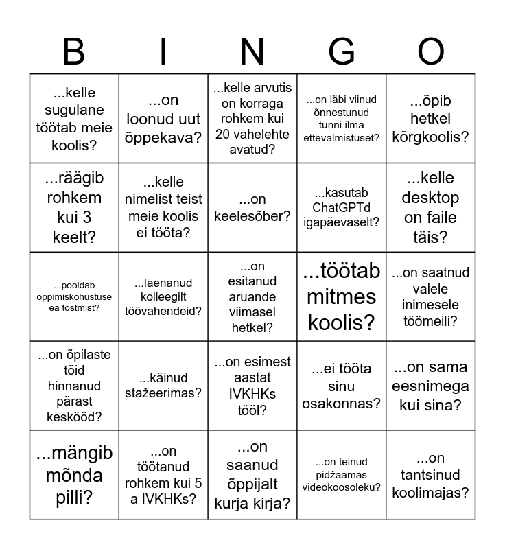 This bingo card has a free space and 24 words: ...käinud stažeerimas?, ...on töötanud rohkem kui 5 a IVKHKs?, ...on keelesõber?, ...mängib mõnda pilli?, ...õpib hetkel kõrgkoolis?, ...kelle sugulane töötab meie koolis?, ...räägib rohkem kui 3 keelt?, ...on loonud uut õppekava?, ...töötab mitmes koolis?, ...on esimest aastat IVKHKs tööl?, ...kasutab ChatGPTd igapäevaselt?, ...pooldab õppimiskohustuse ea tõstmist?, ...ei tööta sinu osakonnas?, ...on sama eesnimega kui sina?, ...kelle nimelist teist meie koolis ei tööta?, ...on teinud pidžaamas videokoosoleku?, ...on saatnud valele inimesele töömeili?, ...kelle arvutis on korraga rohkem kui 20 vahelehte avatud?, ...kelle desktop on faile täis?, ...laenanud kolleegilt töövahendeid?, ...on tantsinud koolimajas?, ...on õpilaste töid hinnanud pärast keskööd?, ...on läbi viinud õnnestunud tunni ilma ettevalmistuset? and ...on saanud õppijalt kurja kirja?.