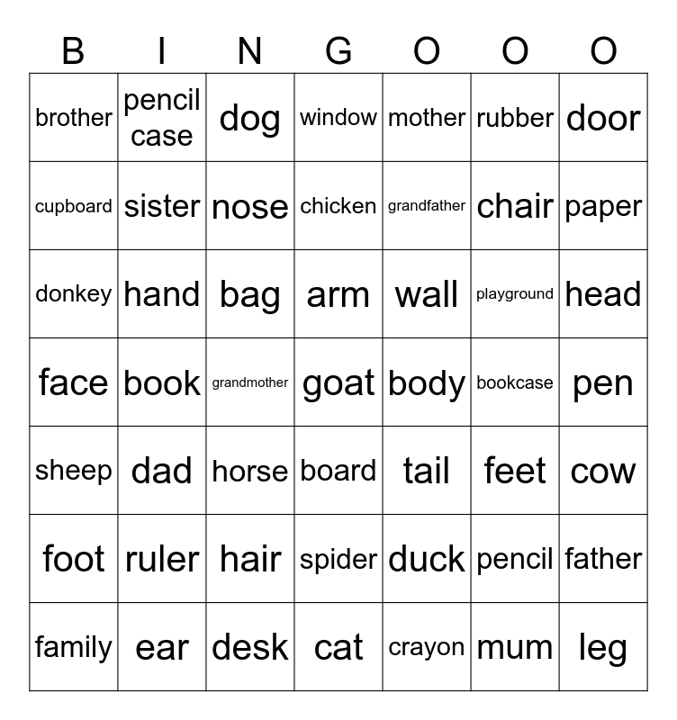This bingo card has 49 words: pencil, chair, crayon, book, bag, pen, pencil case, desk, rubber, board, door, window, playground, wall, ruler, bookcase, cupboard, paper, father, mother, grandfather, grandmother, brother, sister, family, nose, head, ear, arm, hand, leg, body, foot, hair, face, tail, feet, cow, donkey, horse, spider, sheep, goat, cat, chicken, dog, duck, dad and mum.