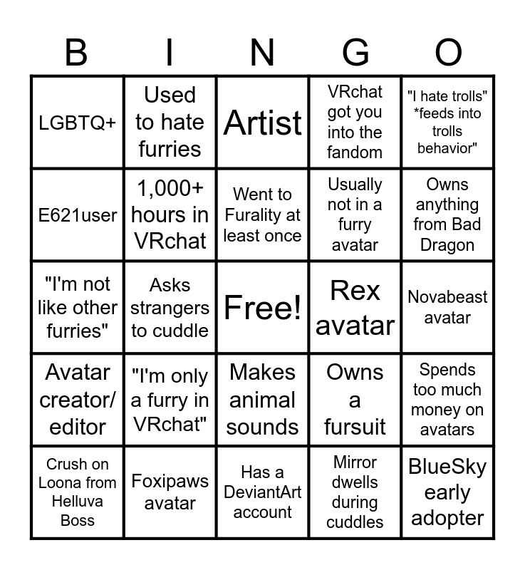 This bingo card has a free space and 24 words: "I'm only a furry in VRchat", Foxipaws avatar, Went to Furality at least once, Crush on Loona from Helluva Boss, "I hate trolls" *feeds into trolls behavior", LGBTQ+, E621user, Used to hate furries, Rex avatar, Makes animal sounds, Usually not in a furry avatar, "I'm not like other furries", Owns a fursuit, Spends too much money on avatars, 1,000+ hours in VRchat, Mirror dwells during cuddles, Novabeast avatar, Artist, Owns anything from Bad Dragon, Asks strangers to cuddle, BlueSky early adopter, Avatar creator/ editor, VRchat got you into the fandom and Has a DeviantArt account.