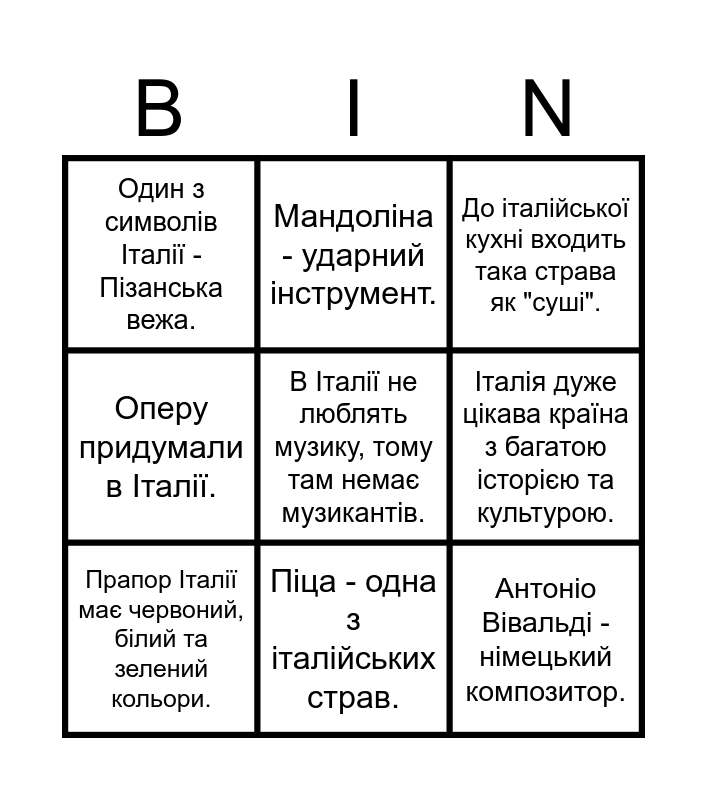 This bingo card has a free space and 8 words: Італія дуже цікава країна з багатою історією та культурою., До італійської кухні входить така страва як "суші"., Мандоліна - ударний інструмент., Прапор Італії має червоний, білий та зелений кольори., Один з символів Італії - Пізанська вежа., Антоніо Вівальді - німецький композитор., Оперу придумали в Італії. and Піца - одна з італійських страв..