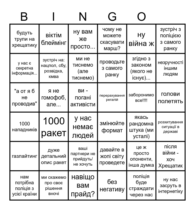 This bingo card has 36 words: 1000 нападників, 1000 ракет, навіщо вам прайд?, проводьте з самого ранку, заборонимо все!!!!, голови полетять, будуть трупи на хрещатику, ми скажемо про своє рішення вночі, ну вам же просто..., давайте в жопі світу проведете, згідно з законом (якого не існує)..., зустріч з поліцією з самого ранку, газлайтинг, я не гомофоб, але..., ми не тиснемо (але тиснемо), чому не можете скасувати марш?, це ж просто опоненти, інша думка, розхитування ситуації в державі, у нас є секретна інформація..., зустріч на: нацпол, сбу, розвідка, кмва, у нас немає людей, змінюйте формат, якась рандомна штука (ми усталі), після війни - хоч Хрещатик, "а от я б не проводив", віктім блеймінг, ви - погані активісти, без негативу, ну війна ж, незручності іншим людям, нам потрібна поліція з усієї країни, дуже детальний опис ракет, ваші партнери не прийдуть/ не хочуть, перерахування регалій, поліція буде страждати через нас and ну нас засруть в інтернетіку.