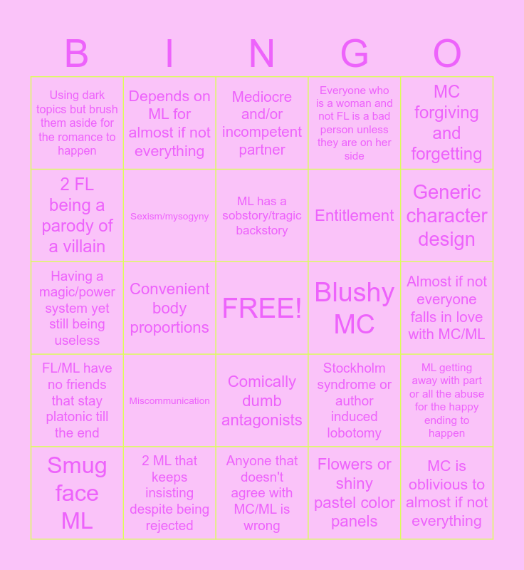 This bingo card has a free space and 24 words: Smug face ML, Miscommunication, ML has a sobstory/tragic backstory, Flowers or shiny pastel color panels, MC forgiving and forgetting, Using dark topics but brush them aside for the romance to happen, Depends on ML for almost if not everything, Mediocre and/or incompetent partner, Blushy MC, Almost if not everyone falls in love with MC/ML, Having a magic/power system yet still being useless, Sexism/mysogyny, Stockholm syndrome or author induced lobotomy, ML getting away with part or all the abuse for the happy ending to happen, 2 FL being a parody of a villain, 2 ML that keeps insisting despite being rejected, Anyone that doesn't agree with MC/ML is wrong, Everyone who is a woman and not FL is a bad person unless they are on her side, Generic character design, FL/ML have no friends that stay platonic till the end, Convenient body proportions, Comically dumb antagonists, Entitlement and MC is oblivious to almost if not everything.