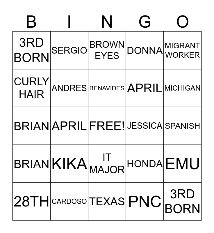 This bingo card has a free space and 24 words: KIKA, CARDOSO, BENAVIDES, 28TH, MIGRANT WORKER, 3RD BORN, CURLY HAIR, SERGIO, JESSICA, IT MAJOR, APRIL, BRIAN, HONDA, EMU, ANDRES, PNC, SPANISH, BROWN EYES, MICHIGAN, APRIL, 3RD BORN, BRIAN, DONNA and TEXAS.