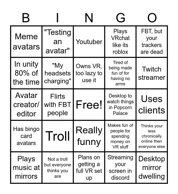 This bingo card has a free space and 24 words: Troll, Not a troll but everyone thinks you are, Owns VR, too lazy to use it, Plays music at mirrors, FBT, but your trackers are dead, Meme avatars, In unity 80% of the time, "Testing an avatar", Desktop to watch things in Popcorn Palace, Really funny, Tired of being made fun of for having no arms, Avatar creator/ editor, Makes fun of people for spending money on VR stuff, Thinks your less chronically online then everyone else, "My headsets charging", Streaming your screen in discord, Uses clients, Youtuber, Twitch streamer, Flirts with FBT people, Desktop mirror dwelling, Has bingo card avatars, Plays VRchat like its roblox and Plans on getting a full VR set up.