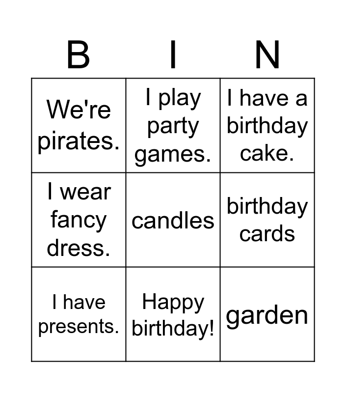 This bingo card has 9 words: I have presents., I have a birthday cake., I play party games., I wear fancy dress., We're pirates., birthday cards, candles, garden and Happy birthday!.