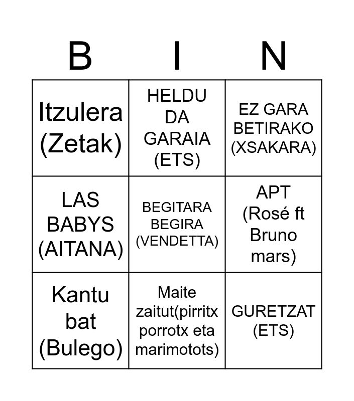 This bingo card has a free space and 8 words: APT (Rosé ft Bruno mars), EZ GARA BETIRAKO (XSAKARA), HELDU DA GARAIA (ETS), Kantu bat (Bulego), Itzulera (Zetak), GURETZAT (ETS), LAS BABYS (AITANA) and Maite zaitut(pirritx porrotx eta marimotots).