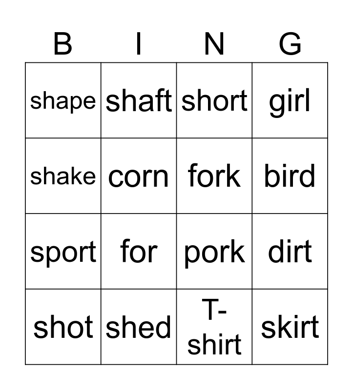 This bingo card has 16 words: shed, dirt, short, shape, sport, shaft, pork, T-shirt, shake, corn, shot, girl, for, bird, fork and skirt.