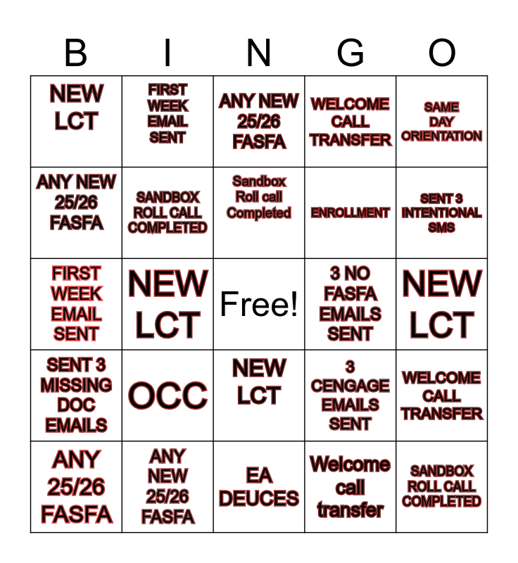 This bingo card has a free space and 24 words: OCC, ANY NEW 25/26 FASFA, Sandbox Roll call Completed, ANY 25/26 FASFA, SAME DAY ORIENTATION, NEW LCT, ANY NEW 25/26 FASFA, FIRST WEEK EMAIL SENT, 3 NO FASFA EMAILS SENT, NEW LCT, ENROLLMENT, FIRST WEEK EMAIL SENT, 3 CENGAGE EMAILS SENT, WELCOME CALL TRANSFER, SANDBOX ROLL CALL COMPLETED, Welcome call transfer, NEW LCT, ANY NEW 25/26 FASFA, SENT 3 INTENTIONAL SMS, NEW LCT, SANDBOX ROLL CALL COMPLETED, SENT 3 MISSING DOC EMAILS, WELCOME CALL TRANSFER and EA DEUCES.