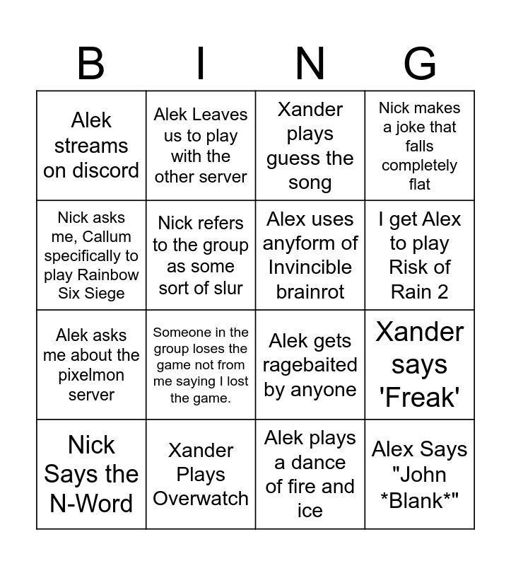 This bingo card has 16 words: Xander Plays Overwatch, Xander says 'Freak', Xander plays guess the song, Alek streams on discord, Alek asks me about the pixelmon server, Alek Leaves us to play with the other server, Alek gets ragebaited by anyone, Alek plays a dance of fire and ice, Nick asks me, Callum specifically to play Rainbow Six Siege, Nick refers to the group as some sort of slur, Nick Says the N-Word, Nick makes a joke that falls completely flat, Someone in the group loses the game not from me saying I lost the game., I get Alex to play Risk of Rain 2, Alex uses anyform of Invincible brainrot and Alex Says "John *Blank*".