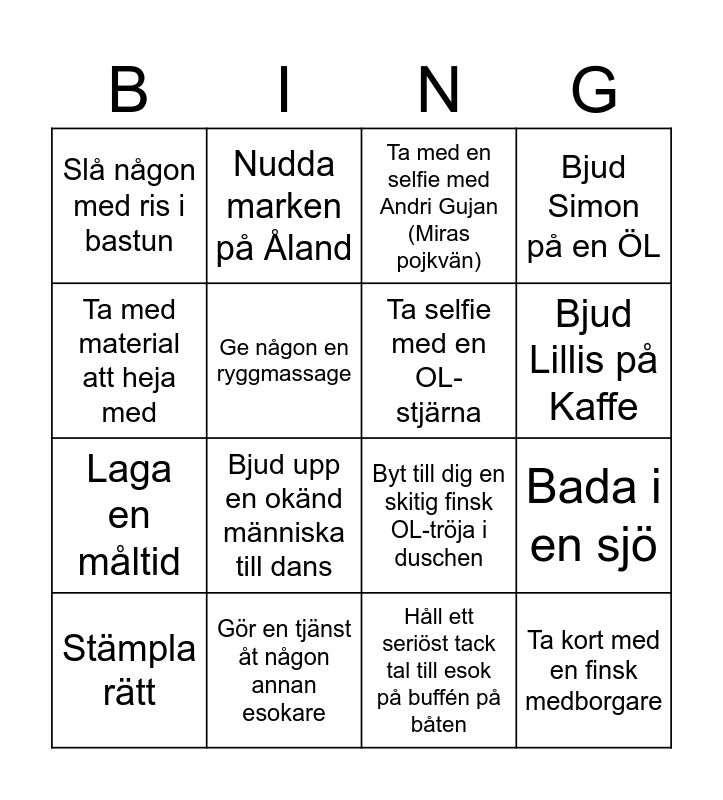 This bingo card has 16 words: Gör en tjänst åt någon annan esokare, Bada i en sjö, Ta med en selfie med Andri Gujan (Miras pojkvän), Slå någon med ris i bastun, Laga en måltid, Nudda marken på Åland, Byt till dig en skitig finsk OL-tröja i duschen, Håll ett seriöst tack tal till esok på buffén på båten, Ta med material att heja med, Ge någon en ryggmassage, Stämpla rätt, Bjud Simon på en ÖL, Bjud upp en okänd människa till dans, Bjud Lillis på Kaffe, Ta selfie med en OL-stjärna and Ta kort med en finsk medborgare.