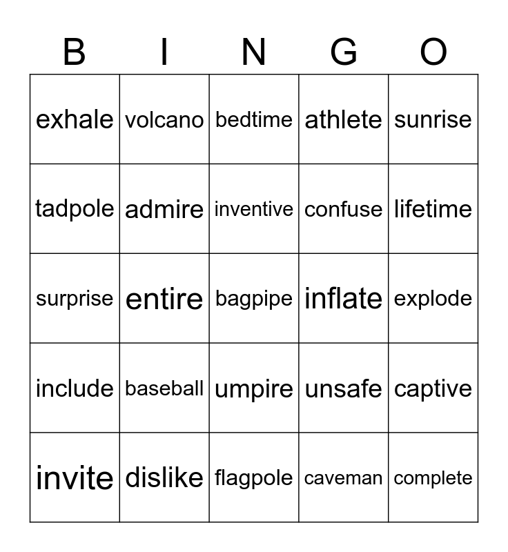 This bingo card has a free space and 29 words: invite, reptile, entire, inside, exhale, bedtime, admire, baseball, inflate, dislike, explode, complete, flagpole, caveman, lifetime, volume, umpire, include, sunrise, surprise, unsafe, costume, confuse, tadpole, athlete, volcano, captive, inventive and valentine.