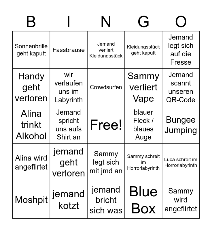 This bingo card has a free space and 24 words: jemand geht verloren, jemand kotzt, Crowdsurfen, Moshpit, Jemand legt sich auf die Fresse, Sonnenbrille geht kaputt, Handy geht verloren, Fassbrause, blauer Fleck / blaues Auge, Sammy legt sich mit jmd an, Sammy verliert Vape, Alina trinkt Alkohol, Sammy schreit im Horrorlabyrinth, Luca schreit im Horrorlabyrinth, wir verlaufen uns im Labyrinth, Blue Box, Bungee Jumping, Jemand verliert Kleidungsstück, Jemand scannt unseren QR-Code, Jemand spricht uns aufs Shirt an, Sammy wird angeflirtet, Alina wird angeflirtet, Kleidungsstück geht kaputt and jemand bricht sich was.
