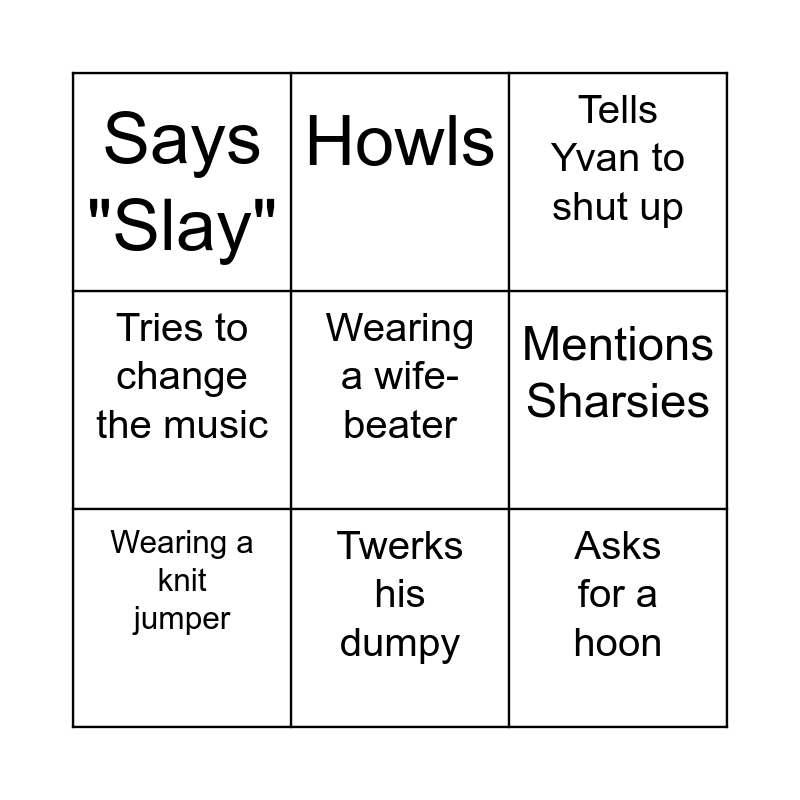 This bingo card has 9 words: Wearing a knit jumper, Tells Yvan to shut up, Howls, Tries to change the music, Says "Slay", Mentions Sharsies, Wearing a wife-beater, Asks for a hoon and Twerks his dumpy.