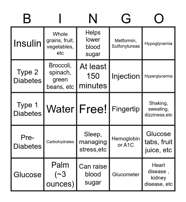 This bingo card has a free space and 24 words: Glucose, Carbohydrates, At least 150 minutes, Glucometer, Hypoglycemia, Insulin, Whole grains, fruit, vegetables, etc, Helps lower blood sugar, Fingertip, Shaking, sweating, dizziness,etc, Type 1 Diabetes, Broccoli, spinach, green beans, etc, Hemoglobin or A1C, Glucose tabs, fruit juice, etc, Type 2 Diabetes, Palm (~3 ounces), Can raise blood sugar, Metformin, Sulfonylureas, Hyperglycemia, Pre-Diabetes, Water, Sleep, managing stress,etc, Injection and Heart disease , kidney disease, etc.