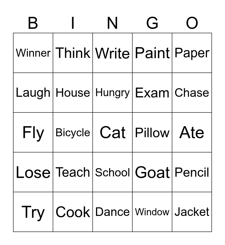 This bingo card has a free space and 24 words: Try, Teach, Hungry, Window, Paper, Winner, Think, Write, Pillow, Ate, Fly, House, Goat, Pencil, Laugh, Cook, Dance, Paint, Chase, Lose, Bicycle, School, Exam and Jacket.