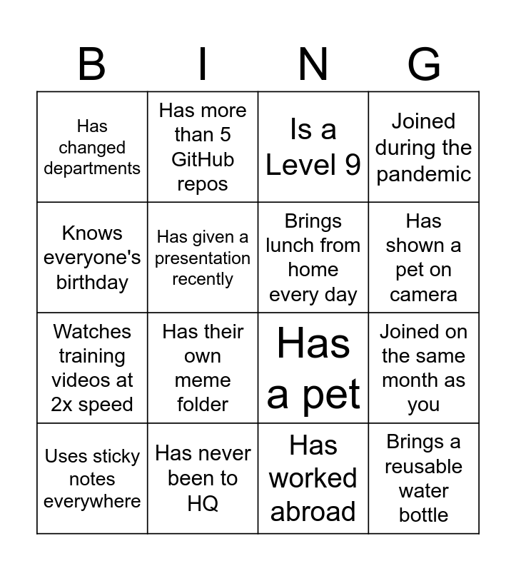 This bingo card has 79 words: Free!, Worked at the company 10+ years, Is a Level 9, Is a Level 10, Has worked with a major client, Has worked in more than 3 teams, Knows the Wi-Fi password, Uses dark mode, Prefers tea over coffee, Has more than 3 monitors, Works remotely full-time, Joined in the last 3 months, Joined during the pandemic, Has changed departments, Leads a team, Has given a presentation recently, Has done a live incident call, Mentors someone, Is being mentored, Has worked abroad, Uses keyboard shortcuts for everything, Knows everyone's birthday, Has a pet, Has shown a pet on camera, Brings lunch from home every day, Eats the same lunch every day, Uses Notion religiously, Has unread Slack messages, Never checks their calendar, Blocks out focus time, Has their own meme folder, Knows the CEO's favorite phrase, Attended an all-hands this month, Is on-call this week, Has been to the office this year, Has never been to HQ, Still uses Internet Explorer (ironically?), Has a mechanical keyboard, Writes documentation voluntarily, Uses sticky notes everywhere, Was in the office past 8pm, Has taken a work trip, Can recite the company values, Was involved in a merger, Can touch-type, Has more than 5 GitHub repos, Attended a work conference, Wears headphones all day, Knows the fire warden, Knows the first aid officer, Has the same job title as you, Joined on the same month as you, Uses emojis in emails, Uses GIFs in Slack, Has a second monitor, Has a standing desk, Decorated their home office, Is left-handed, Commutes more than an hour, Brings baked goods to the office, Watches training videos at 2x speed, Has more than 10 years experience, Used to work in a different industry, Has worked on 10+ projects, Reads tech blogs, Has submitted a patent, Hates video calls, Loves spreadsheets, Has memorized Jira shortcuts, Brings a reusable water bottle, Has lost a badge before, Has an office nickname, Uses a trackball mouse, Keeps a plant on their desk, Writes their own scripts/tools, Has worked on a weekend release, Keeps their camera off always, Forgets to unmute themselves and Can name all execs without Googling.