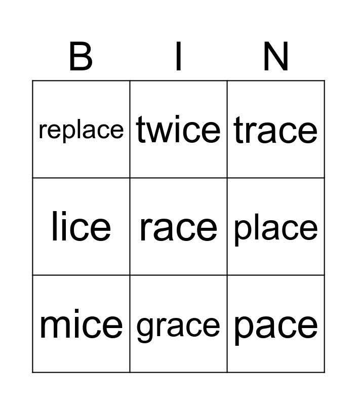 This bingo card has 13 words: rice, face, mice, twice, lice, race, pace, lace, grace, replace, place, trace and space.