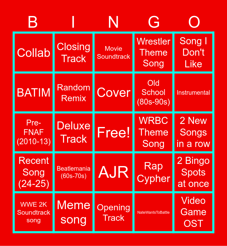 This bingo card has a free space and 36 words: Repeat Artist, Repeat Album, Repeat Song, Random Remix, Rap Cypher, Recent Song (24-25), Cover, New Artist, Song I Don't Like, Familiar Artist, New Song, Deluxe Track, Wrestler Theme Song, Old-School Nerdcore Days (14-17), WRBC Theme Song, Instrumental, Collab, Playlist Album Track, Beatlemania (60s-70s), Video Game OST, Movie Soundtrack, 2 New Songs in a row, 2 Bingo Spots at once, Meme song, WWE 2K Soundtrack song, Opening Track, Closing Track, Pre-FNAF (2010-13), As old as me (2005), Old School (80s-90s), BATIM, FNAF, DAGames, NateWantsToBattle, AJR, Collab Star's Own Song and TITLE TRACK!!!!.