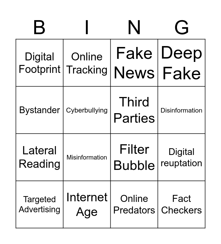 This bingo card has 16 words: Internet Age, Digital reuptation, Fake News, Digital Footprint, Lateral Reading, Online Tracking, Filter Bubble, Online Predators, Bystander, Cyberbullying, Targeted Advertising, Deep Fake, Misinformation, Disinformation, Third Parties and Fact Checkers.