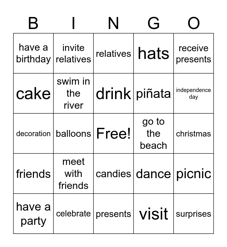 This bingo card has a free space and 24 words: meet with friends, celebrate, drink, have a party, receive presents, have a birthday, cake, invite relatives, go to the beach, candies, piñata, decoration, dance, picnic, swim in the river, visit, christmas, relatives, independence day, balloons, surprises, friends, hats and presents.