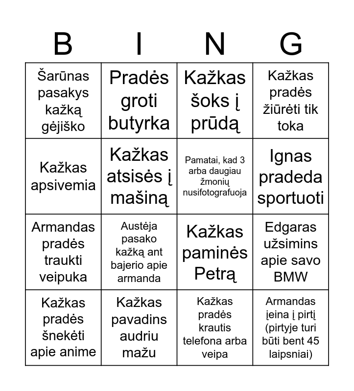 This bingo card has 16 words: Kažkas pavadins audriu mažu, Edgaras užsimins apie savo BMW, Kažkas šoks į prūdą, Šarūnas pasakys kažką gėjiško, Armandas pradės traukti veipuka, Pradės groti butyrka, Kažkas paminės Petrą, Kažkas pradės krautis telefona arba veipa, Kažkas apsivemia, Kažkas atsisės į mašiną, Kažkas pradės šnekėti apie anime, Kažkas pradės žiūrėti tik toka, Austėja pasako kažką ant bajerio apie armanda, Ignas pradeda sportuoti, Pamatai, kad 3 arba daugiau žmonių nusifotografuoja and Armandas įeina į pirtį (pirtyje turi būti bent 45 laipsniai).