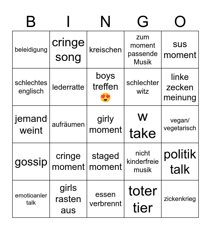 This bingo card has a free space and 24 words: emotioanler talk, cringe moment, boys treffen 😍, toter tier, sus moment, beleidigung, cringe song, kreischen, w take, vegan/ vegetarisch, jemand weint, lederratte, nicht kinderfreie musik, politik talk, schlechtes englisch, girls rasten aus, essen verbrennt, zum moment passende Musik, linke zecken meinung, gossip, aufräumen, staged moment, schlechter witz and zickenkrieg.