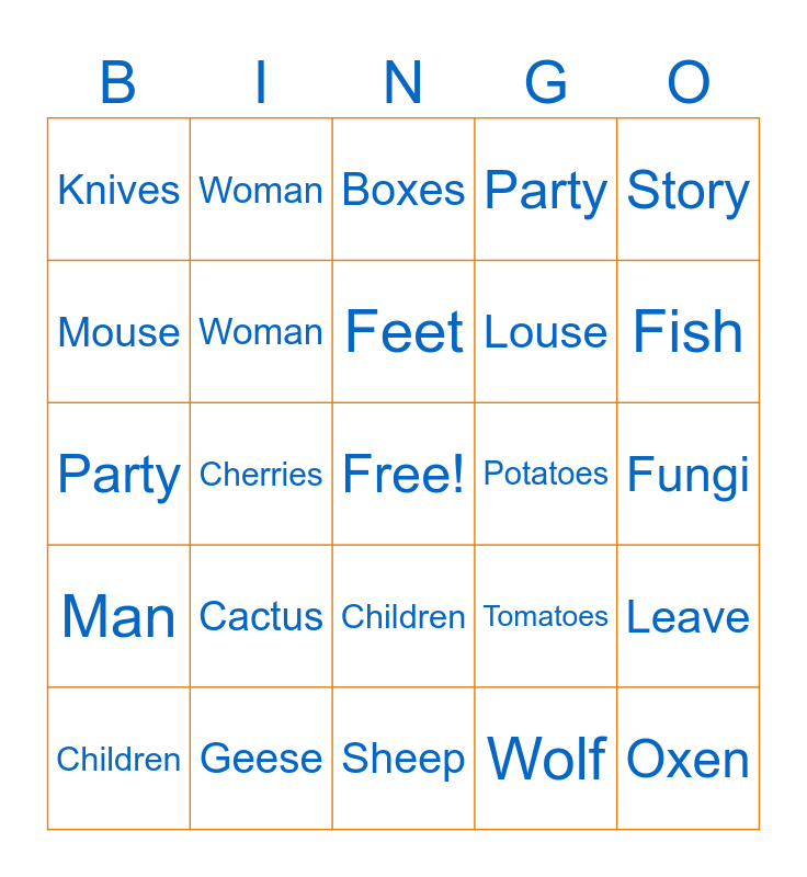 This bingo card has a free space and 29 words: Mouse, Geese, Boxes, Tooth, Story, Knives, Woman, Feet, Potatoes, Leave, Children, Cherries, Wolf, Oxen, Party, Radio, Sheep, Tomatoes, Fish, Man, Cactus, Heroes, Louse, Fungi, Mouse, Woman, Children, Party and Man.