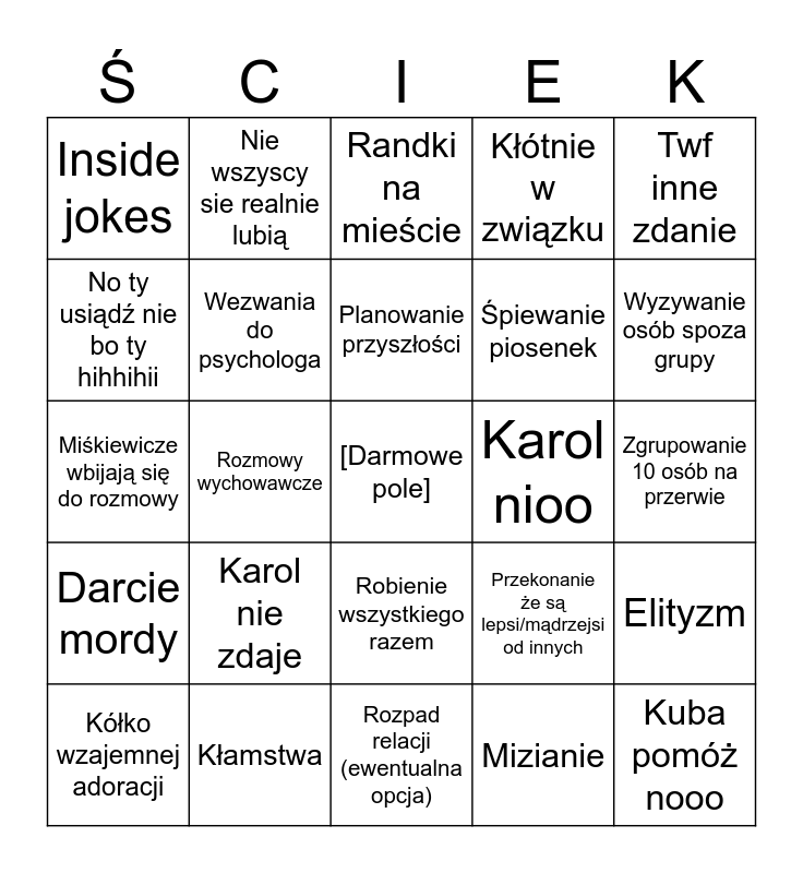 This bingo card has a free space and 24 words: Karol nie zdaje, Kłamstwa, Planowanie przyszłości, Kółko wzajemnej adoracji, Twf inne zdanie, Inside jokes, No ty usiądź nie bo ty hihhihii, Nie wszyscy sie realnie lubią, Karol nioo, Robienie wszystkiego razem, Śpiewanie piosenek, Miśkiewicze wbijają się do rozmowy, Przekonanie że są lepsi/mądrzejsi od innych, Elityzm, Wezwania do psychologa, Mizianie, Zgrupowanie 10 osób na przerwie, Randki na mieście, Wyzywanie osób spoza grupy, Rozmowy wychowawcze, Kuba pomóż nooo, Darcie mordy, Kłótnie w związku and Rozpad relacji (ewentualna opcja).