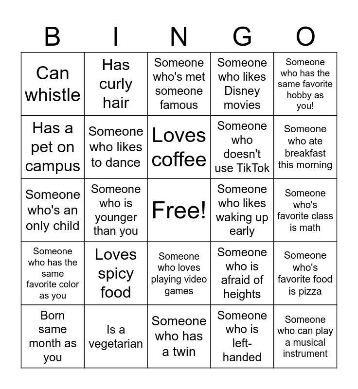 This bingo card has a free space and 24 words: Loves spicy food, Is a vegetarian, Loves coffee, Born same month as you, Someone who has the same favorite hobby as you!, Can whistle, Has a pet on campus, Has curly hair, Someone who likes waking up early, Someone who loves playing video games, Someone who doesn't use TikTok, Someone who's an only child, Someone who is afraid of heights, Someone who's favorite food is pizza, Someone who likes to dance, Someone who is left-handed, Someone who's favorite class is math, Someone who's met someone famous, Someone who ate breakfast this morning, Someone who is younger than you, Someone who can play a musical instrument, Someone who has the same favorite color as you, Someone who likes Disney movies and Someone who has a twin.