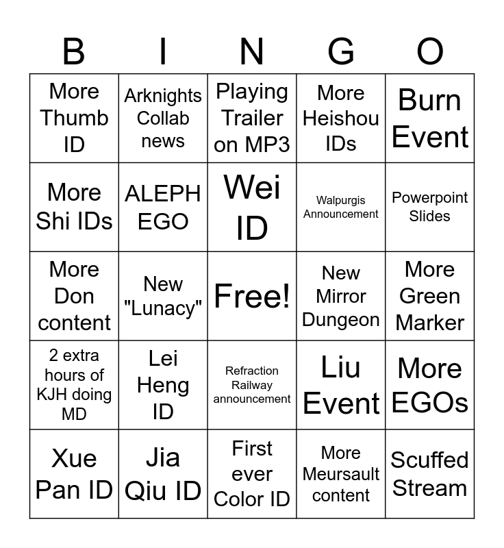 This bingo card has a free space and 24 words: Lei Heng ID, Jia Qiu ID, Wei ID, Xue Pan ID, Burn Event, More Thumb ID, More Shi IDs, Arknights Collab news, New Mirror Dungeon, Refraction Railway announcement, Walpurgis Announcement, More Don content, Liu Event, More EGOs, ALEPH EGO, More Meursault content, More Green Marker, Playing Trailer on MP3, Powerpoint Slides, New "Lunacy", Scuffed Stream, 2 extra hours of KJH doing MD, More Heishou IDs and First ever Color ID.