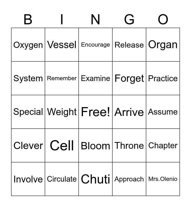 This bingo card has a free space and 24 words: Cell, Circulate, Examine, Involve, Organ, Oxygen, System, Vessel, Arrive, Bloom, Forget, Special, Throne, Chapter, Remember, Approach, Assume, Encourage, Practice, Weight, Mrs.Olenio, Clever, Release and Chuti.