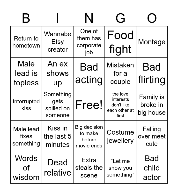 This bingo card has a free space and 29 words: Words of wisdom, A misunderstanding, Something gets spilled on someone, "I love you " is said way too soon, Return to hometown, One of them has corporate job, An ex shows up, Kiss in the last 5 minutes, the love interests don't like each other at first, Dead relative, Family is broke in big house, Bad child actor, Extra steals the scene, “Let me show you something”, Bad flirting, Female lead has curled hair, Big decision to make before movie ends, Male lead fixes something, Montage, Interrupted kiss, Costume jewellery, Female lead obsessed with weddings, Mistaken for a couple, Male lead is topless, Food fight, Wannabe Etsy creator, Falling over meet cute, Bad acting and Tell don’t show.