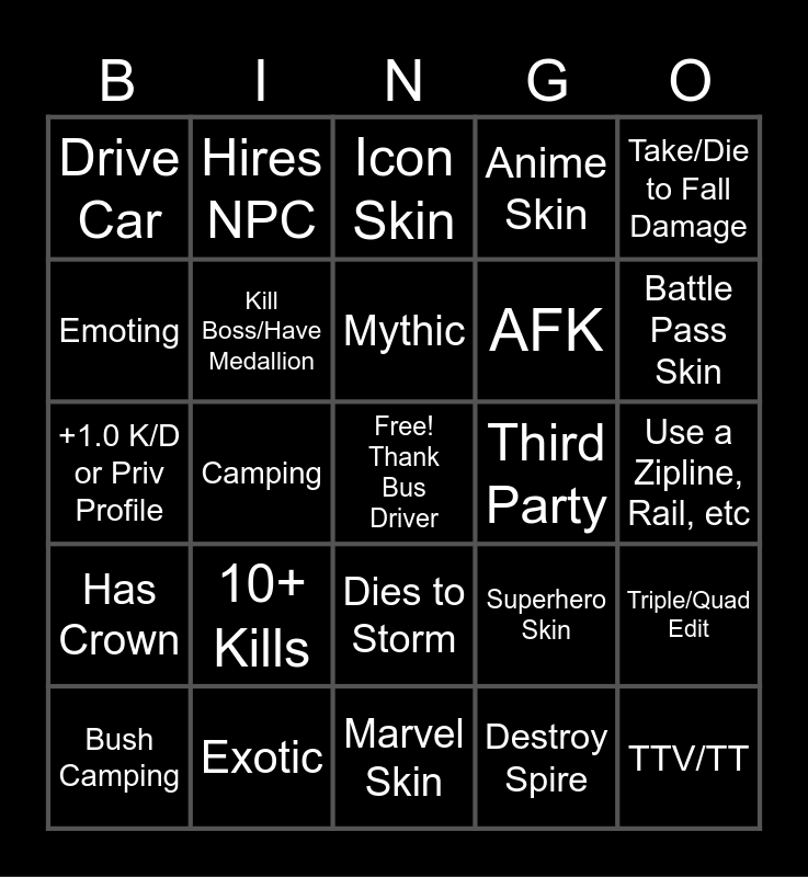 This bingo card has a free space and 24 words: 10+ Kills, Exotic, Mythic, Bush Camping, Take/Die to Fall Damage, Drive Car, Emoting, Hires NPC, Third Party, Dies to Storm, AFK, +1.0 K/D or Priv Profile, Superhero Skin, Triple/Quad Edit, Kill Boss/Have Medallion, Destroy Spire, Use a Zipline, Rail, etc, Icon Skin, Battle Pass Skin, Camping, TTV/TT, Has Crown, Anime Skin and Marvel Skin.