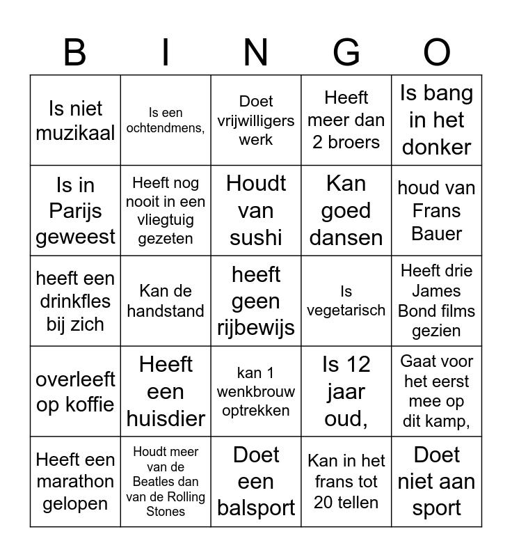 This bingo card has a free space and 49 words: Favoriete kleur is geel, Doet niet aan sport, Speelt een instrument, Doet een balsport, Heeft een huisdier, Is linkshandig, Is een ochtendmens,, Is in oktober geboren, Is in Parijs geweest, Spreekt meer dan 2 talen, Heeft nog nooit in een vliegtuig gezeten, Heeft meer dan 2 broers, Gaat voor het eerst mee op dit kamp,, Is 12 jaar oud,, Heeft iets gebroken, Heeft blauwe ogen, Houdt van sushi, Is vegetarisch, Heeft een allergie, Is bang in het donker, Kan de handstand, Kan in het frans tot 20 tellen, Is niet muzikaal, Kan goed dansen, team toetje, houd van Frans Bauer, Heeft een marathon gelopen, dol op pure chocolade, kan 1 wenkbrouw optrekken, overleeft op koffie, is met de auto, 0.0 jaa, Heeft meer dan 10 landen bezocht, Heeft Harry Potter gelezen, Houdt meer van de Beatles dan van de Rolling Stones, Houdt van wandelen in de bergen, Gaat naar concerten, Houdt van vakantie aan zee, Heeft drie James Bond films gezien, is het oudste kind, slaapt rechts in bed, eet spaghetti met mes en vork, luistert podcasts, haalt lunch in de kantine, heeft een drinkfles bij zich, Doet vrijwilligers werk, heeft parachute gesprongen, vind spelletjes leuk and wilde vroeger bij de brandweer.